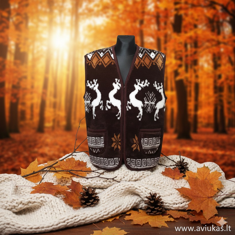Raštuota vilnonė liemenė. Dvigubo storio. Vidus vilna, išorė dirbtinas pluoštas. Tinka tiek moterims tiek vyrams. Vilna gerai išlaiko šilumą, bet leidžia kūnui kvėpuoti. Užsisega užtrauktuku. Kišenės išorėje.
