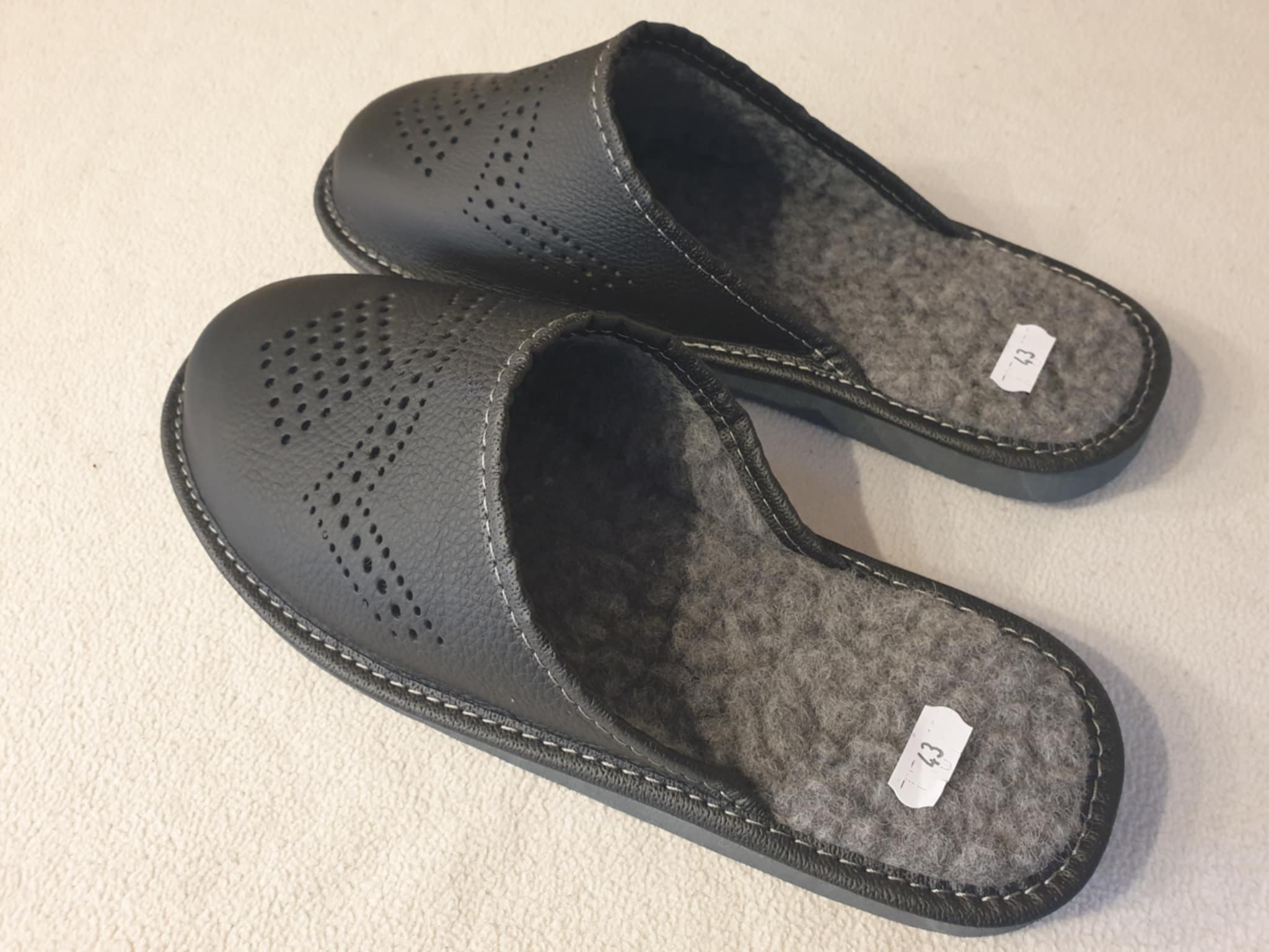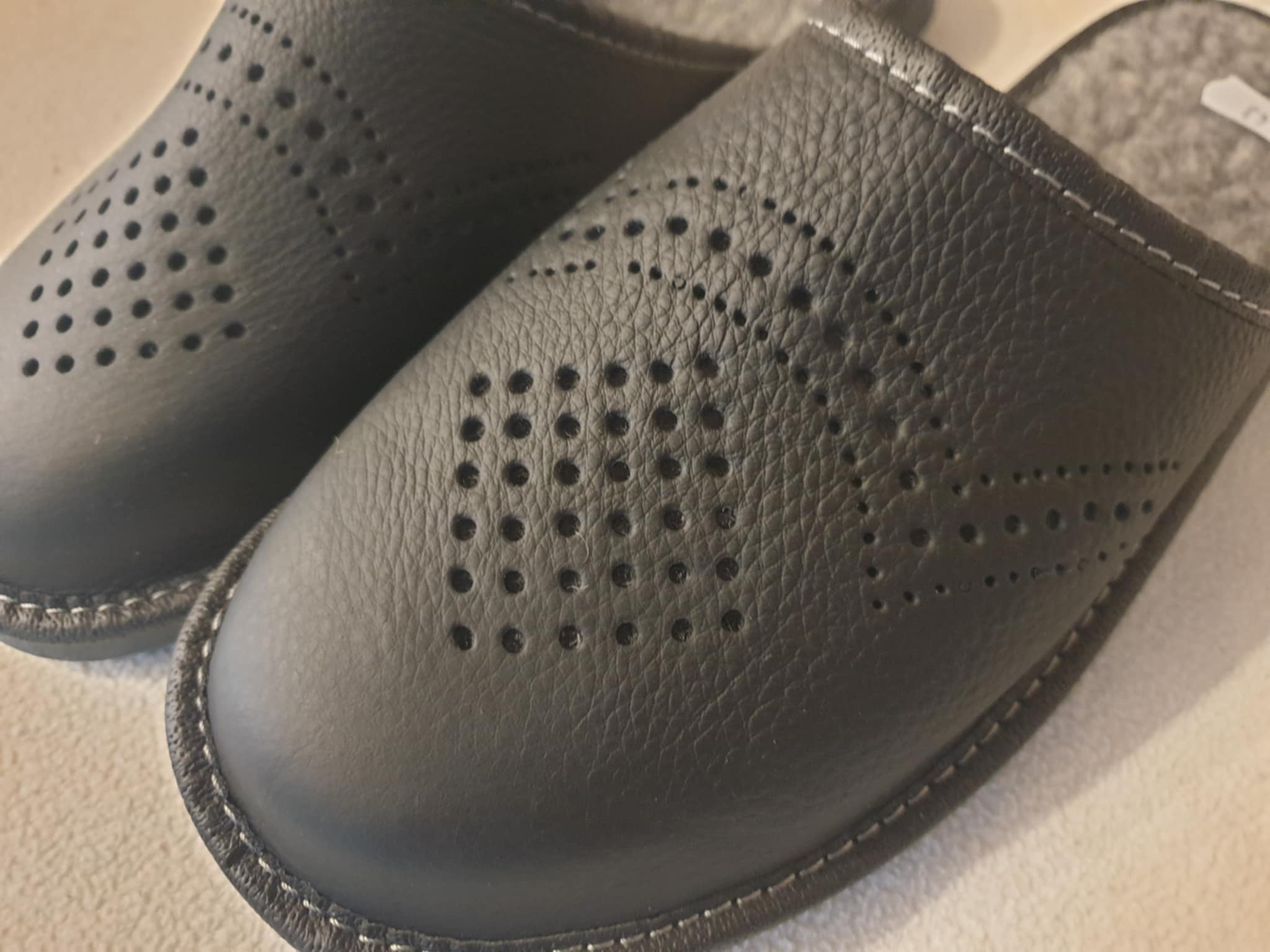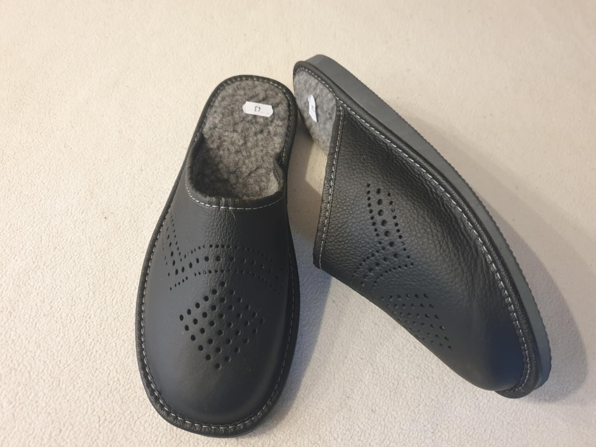 Tai yra juodos, įspiriamojo tipo šlepetės. Išorė pagaminta iš odos. Ant viršaus yra dekoratyvinės skylutės, sudarančios raštą. Viduje yra pilka vilna. Padas storesnis.
