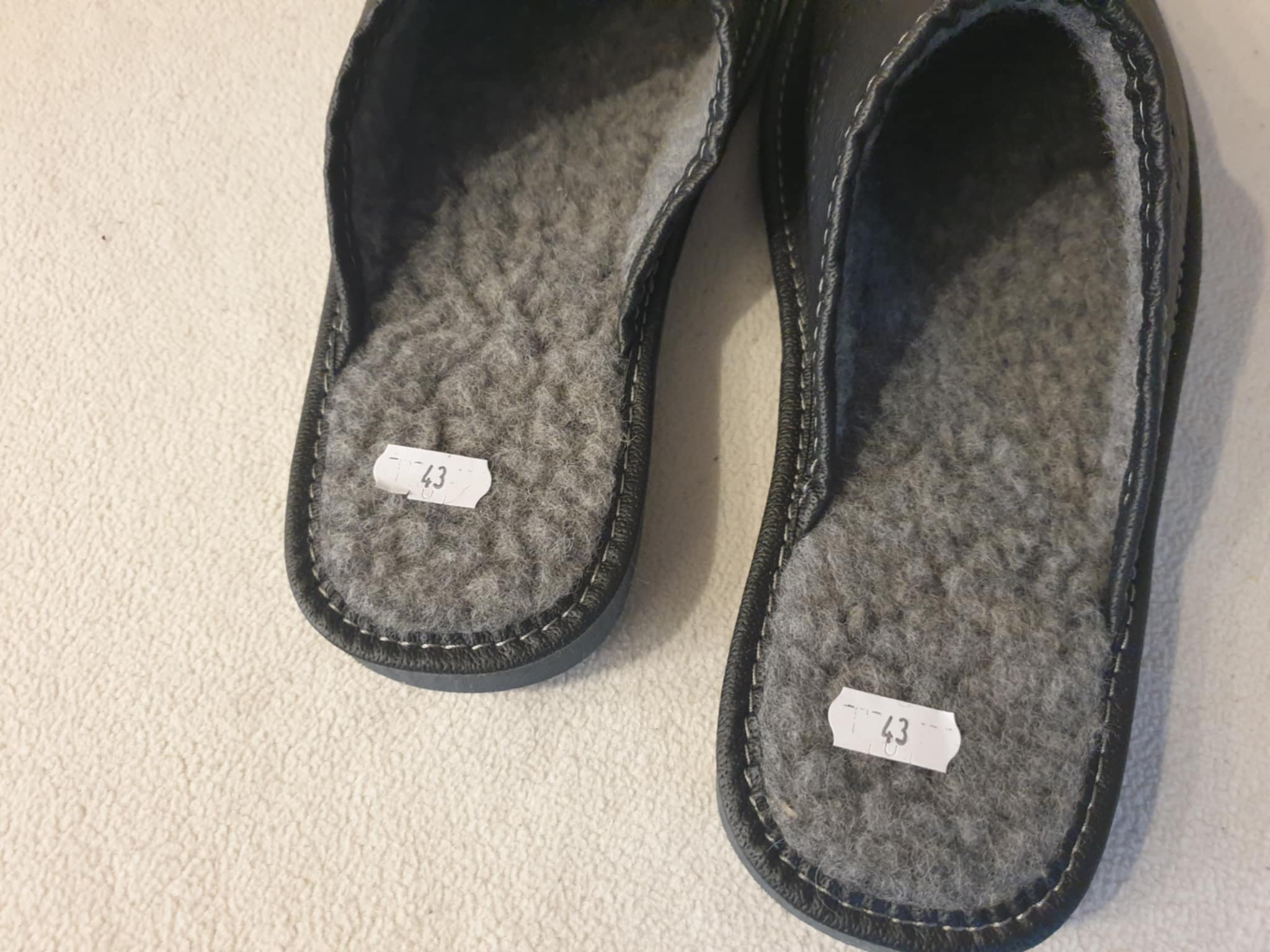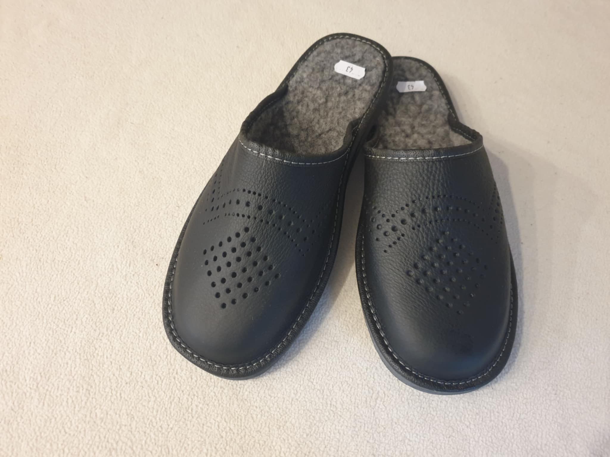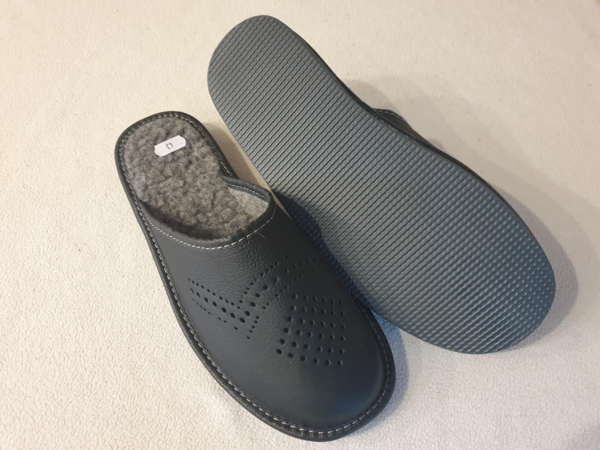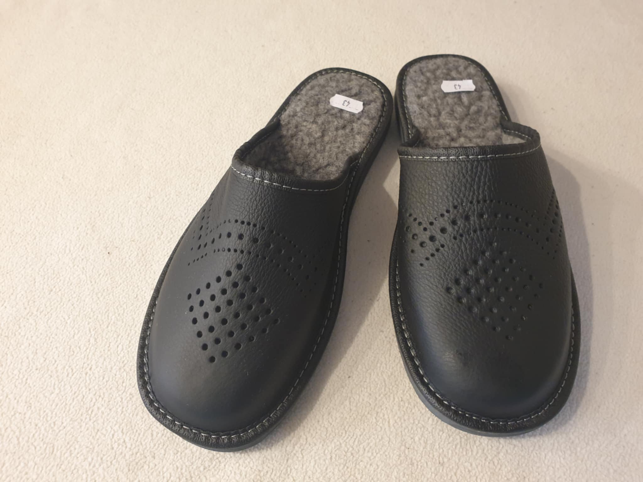 Tai yra juodos, įspiriamojo tipo šlepetės. Išorė pagaminta iš odos. Ant viršaus yra dekoratyvinės skylutės, sudarančios raštą. Viduje yra pilka vilna. Padas storesnis.