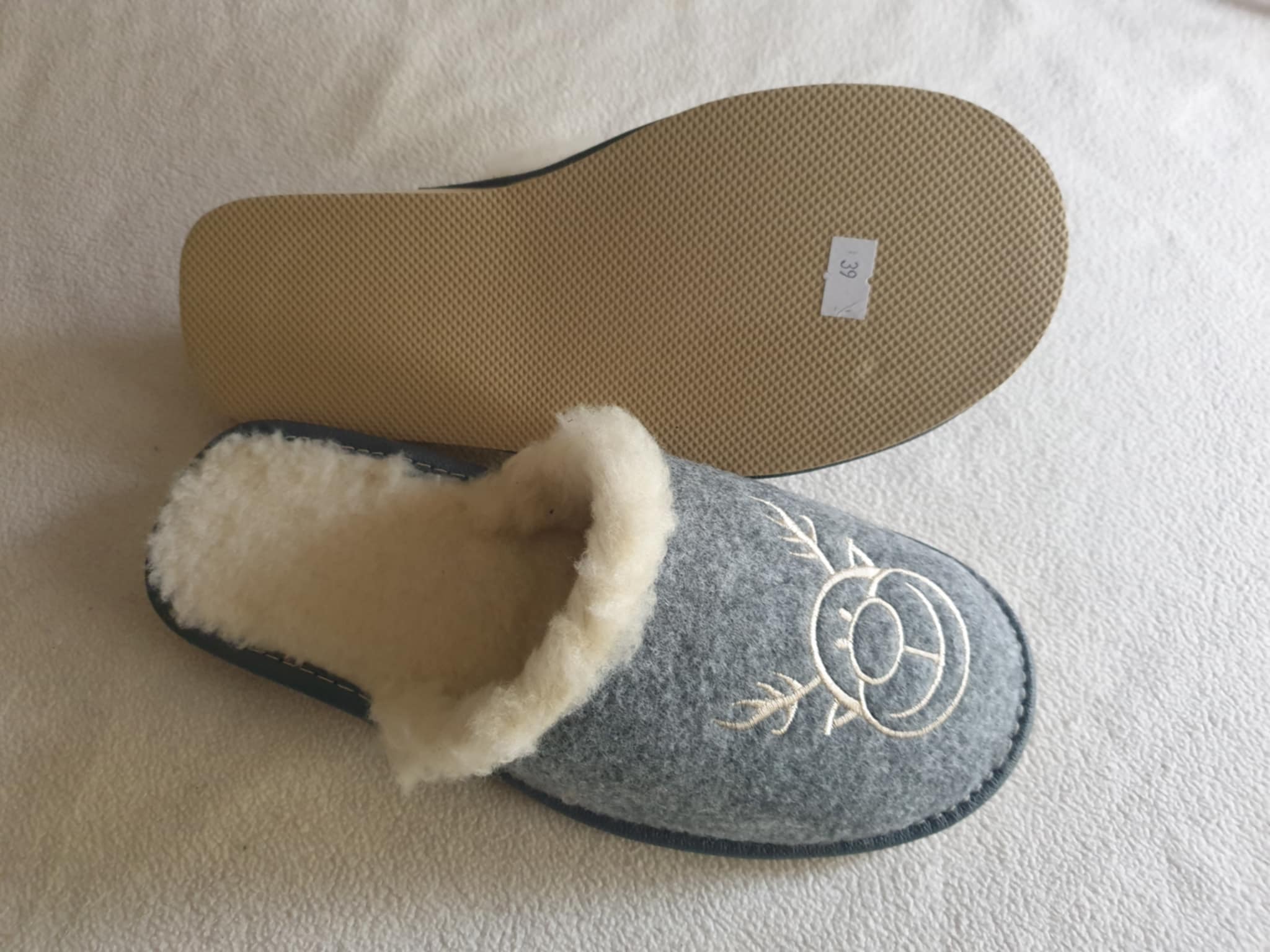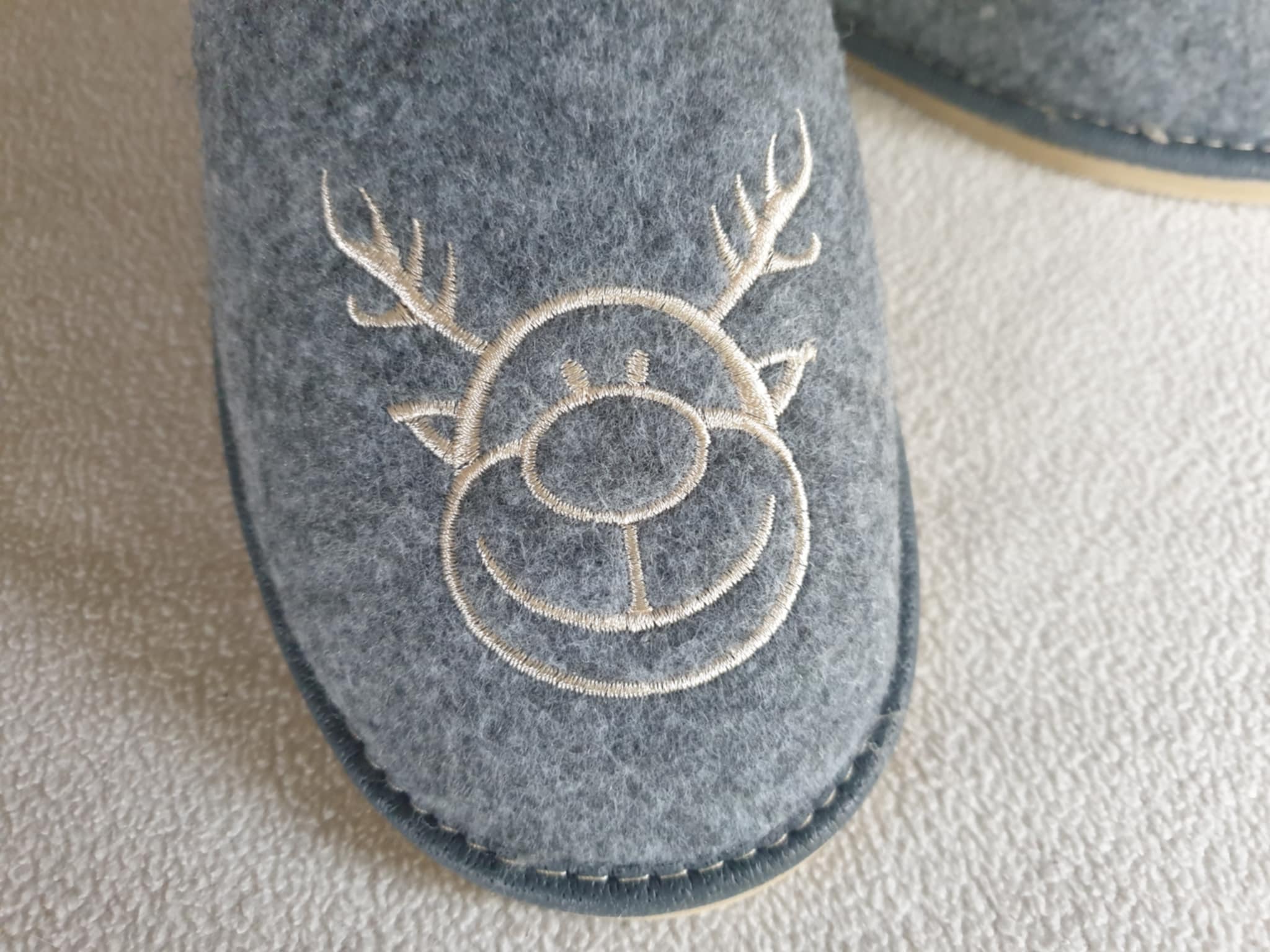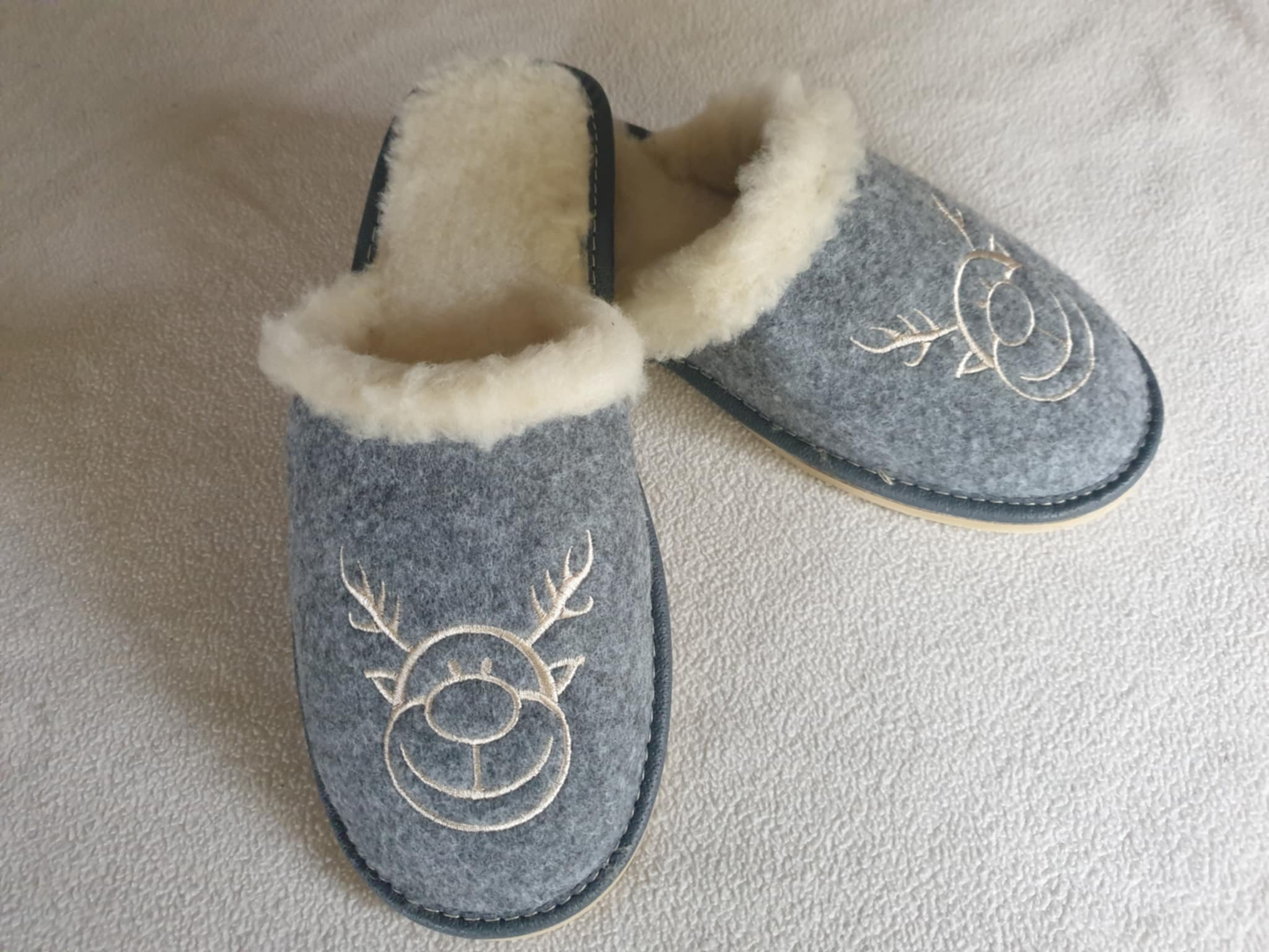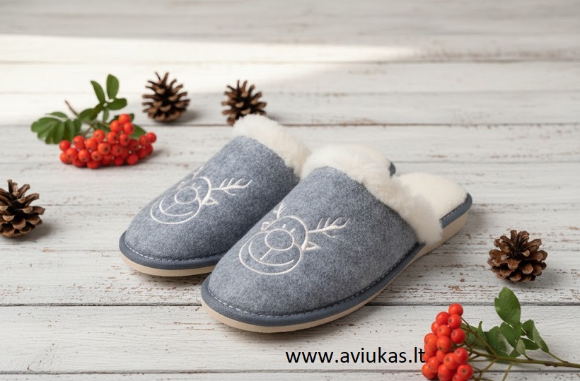 Tai yra veltinės šlepetės atrodančios labai šiltai ir jaukiai. Šlepetės su vilna viduje. Priekyje yra siuvinėtas elnio kontūras, kuris suteikia žiemišką stilių. Padas – avalynės.