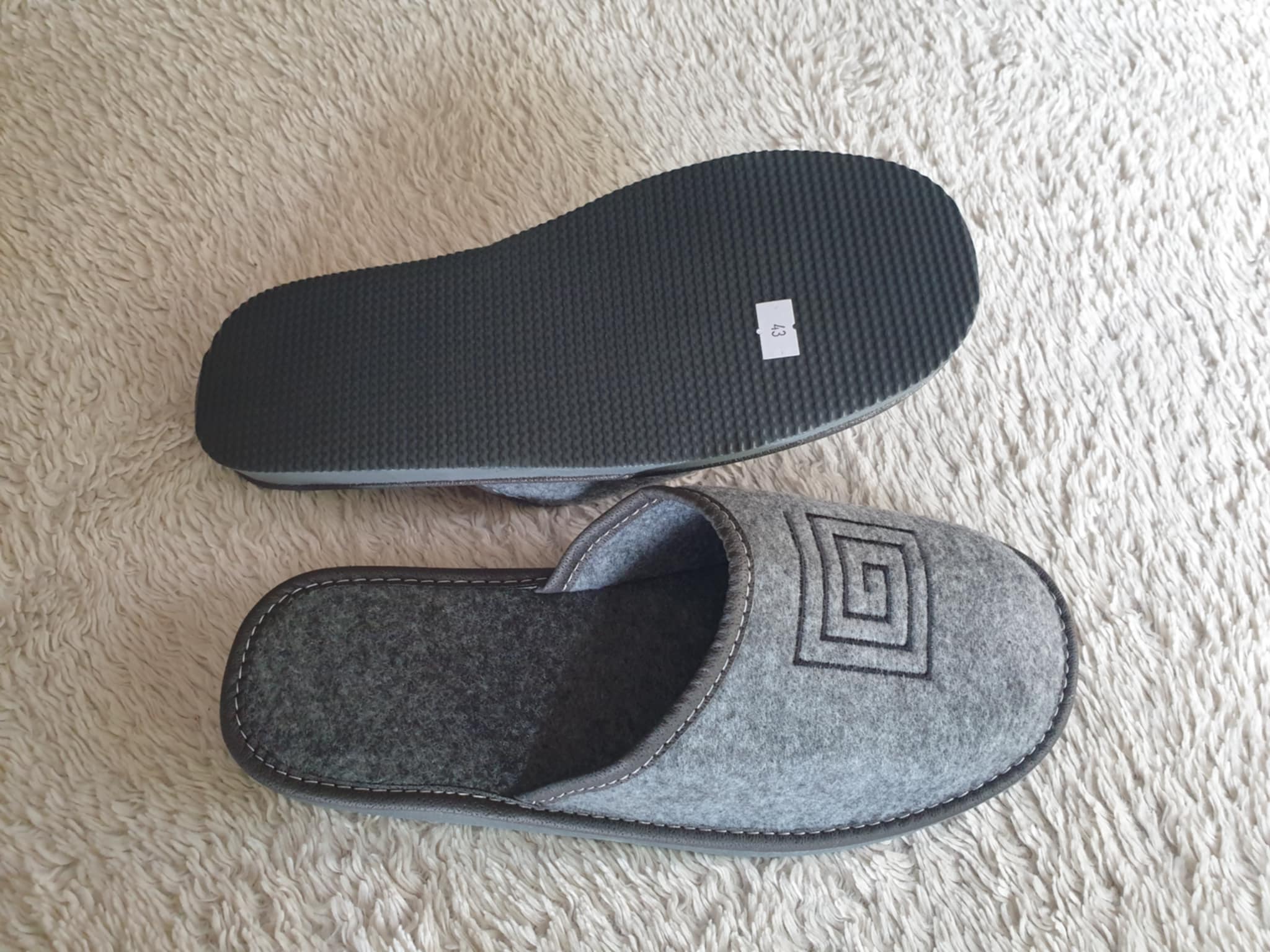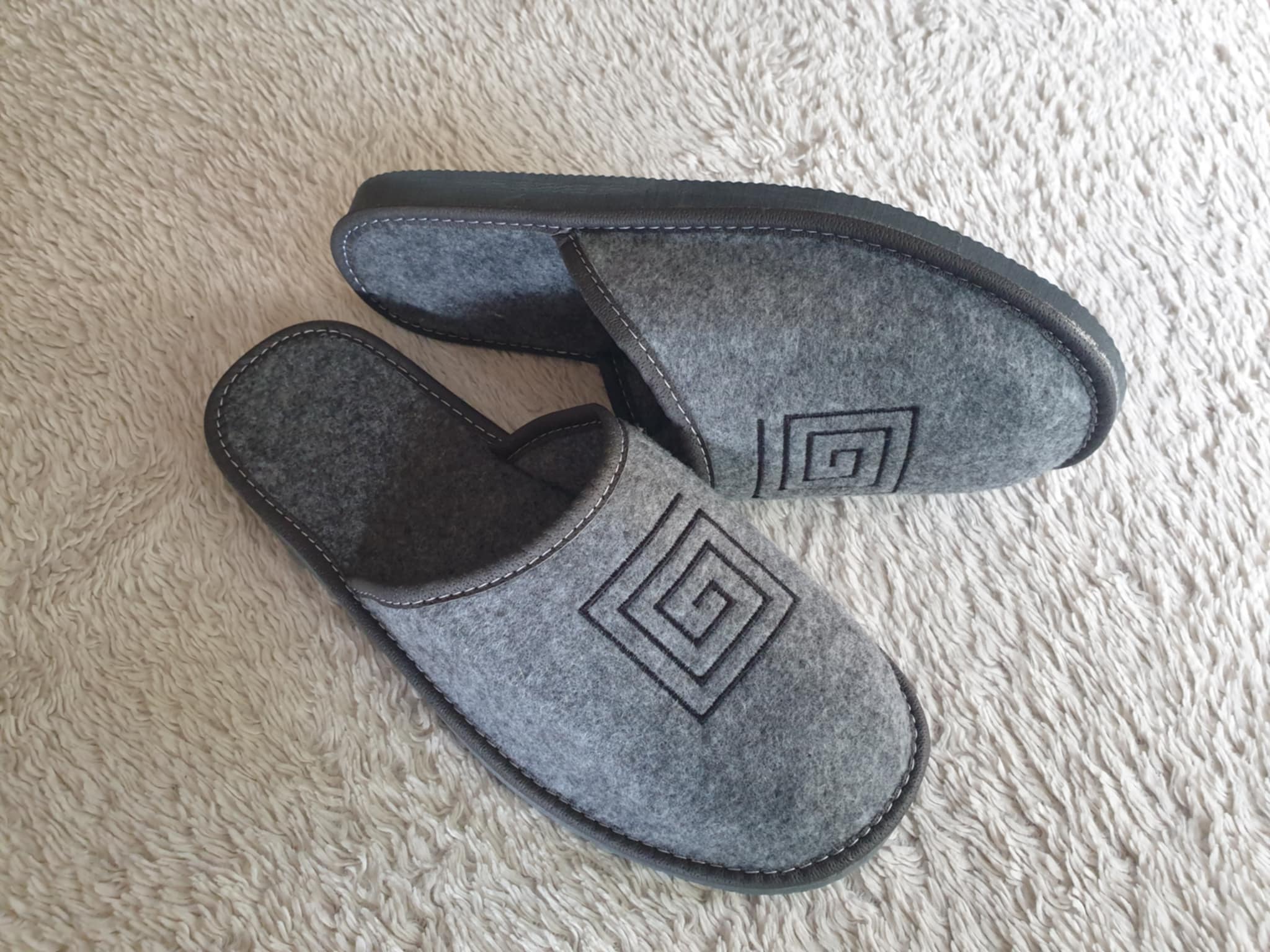 Uždaros, veltinės medžiagos šlepetės. Puoštos siuvinėtu užrašu. Padas avalynės – neslidus.