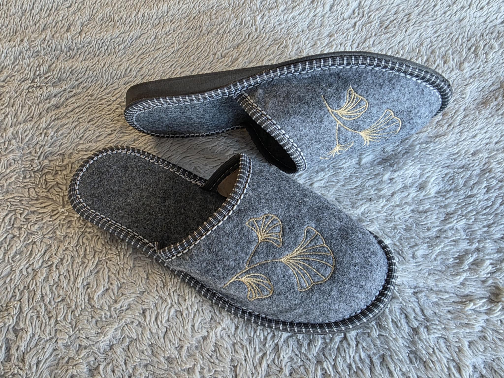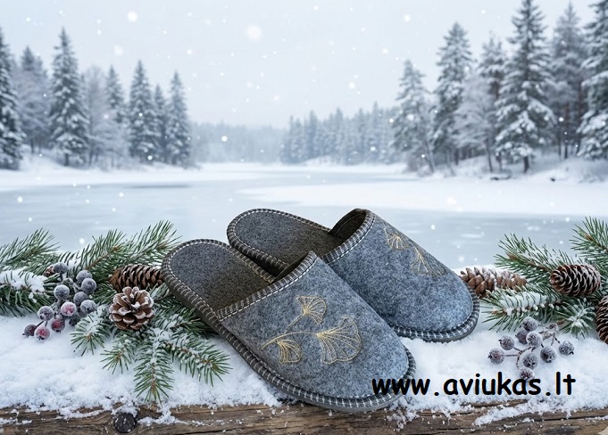 Šlepetės jaukios ir šiltos. Veltinės medžiagos šlepetės. Spalva pilka. Išsiuvinėtas ginkmedžio lapų motyvas, suteikia subtilumo ir ramybės. Padas – avalynės.