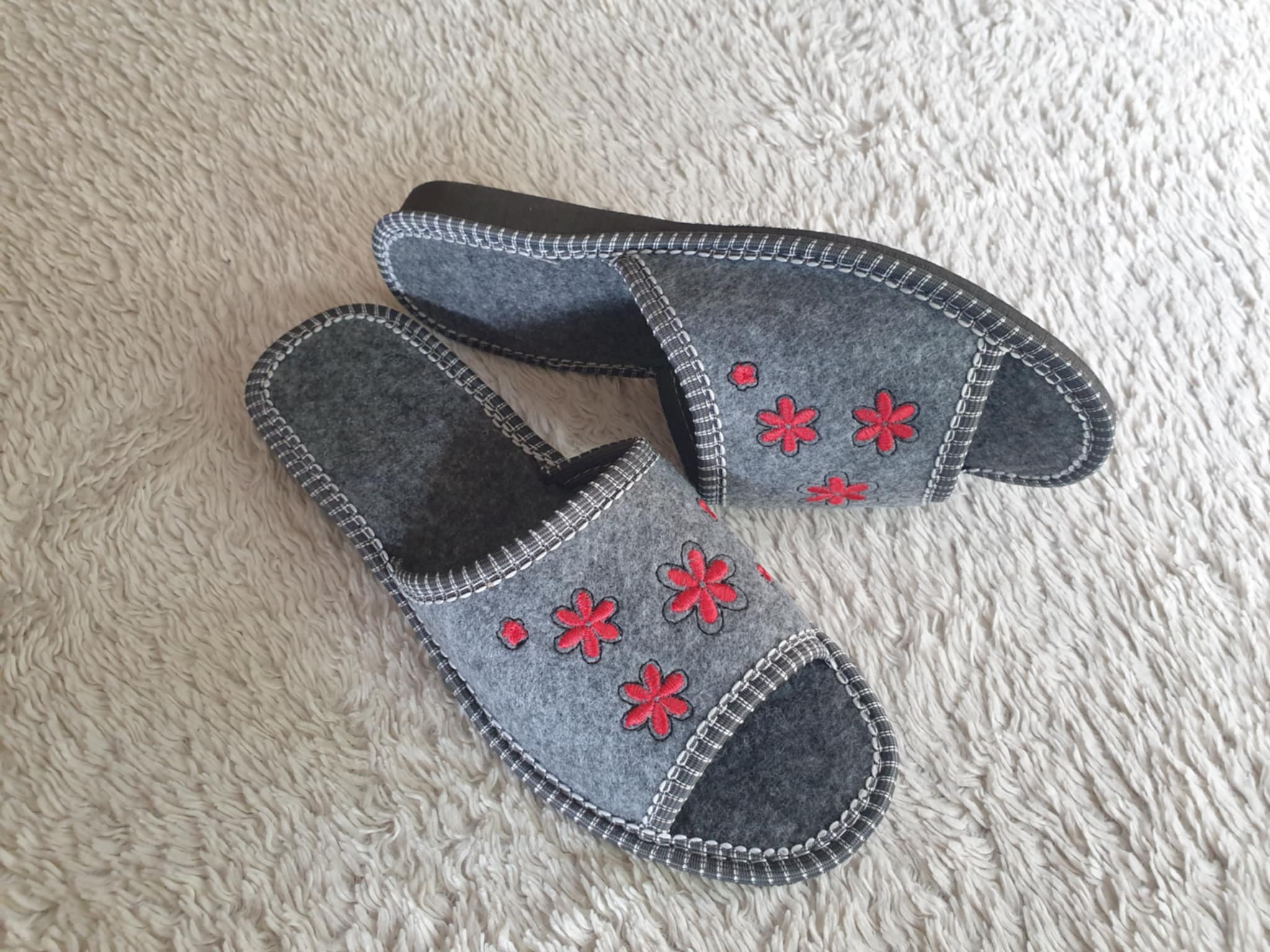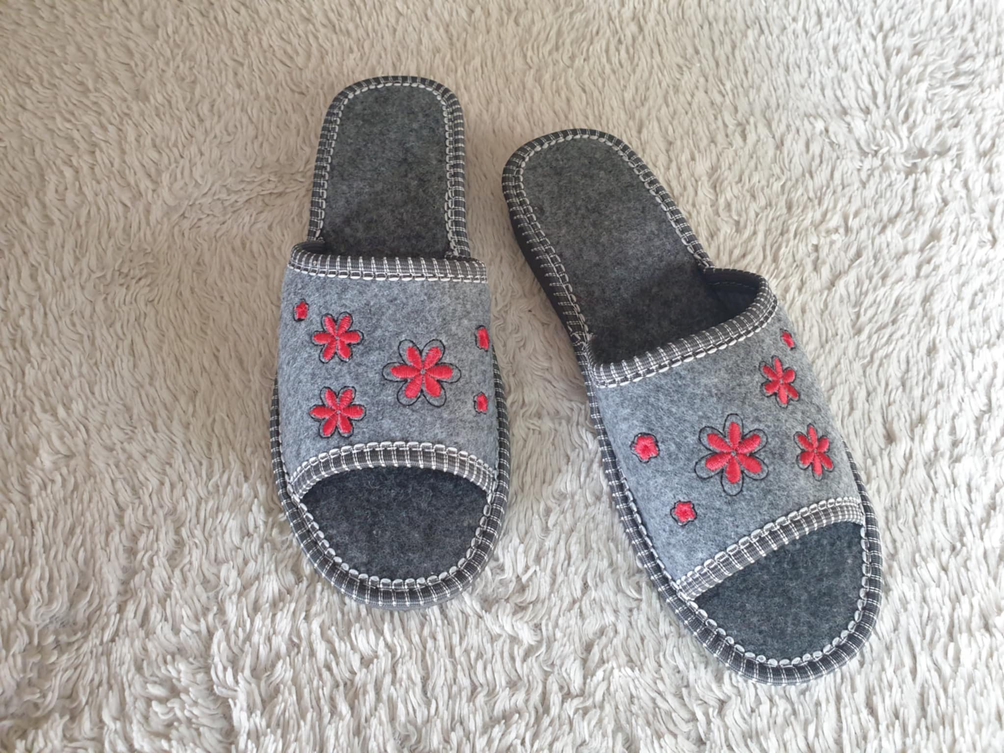 Veltinės medžiagos šlepetės. Puoštos siuvinėtomis gėlėmis. Padas – avalynės.
