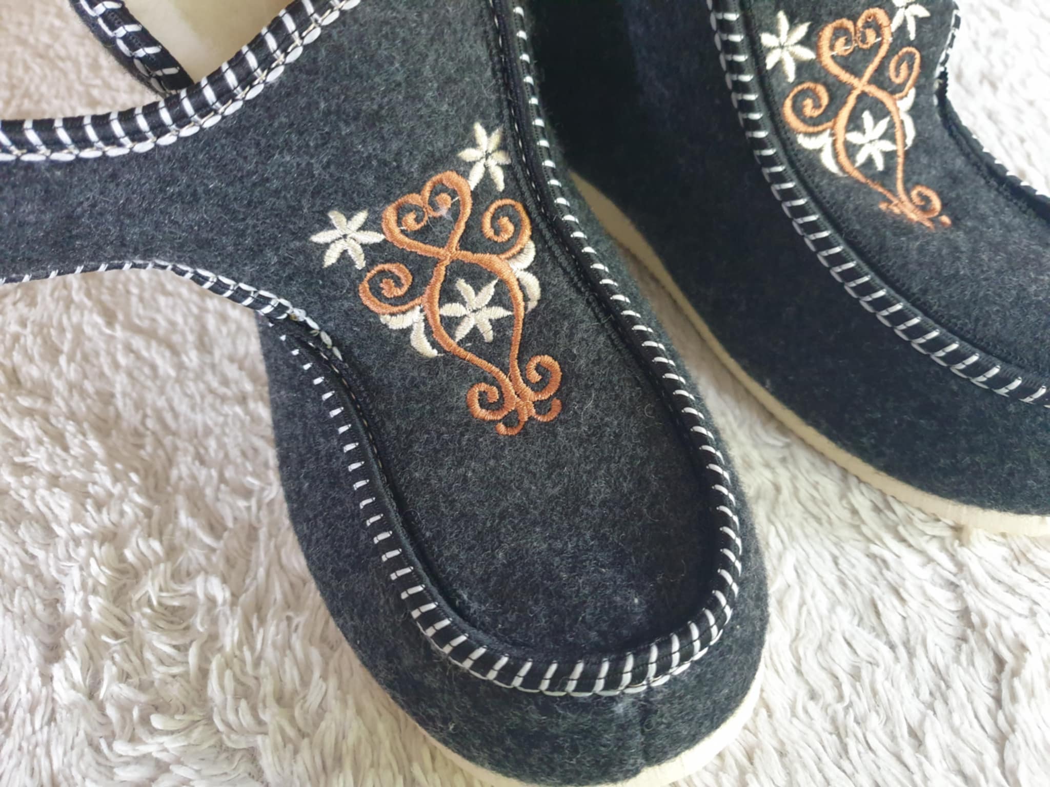 - Subtilus, bet išskirtinis dizainas: Šlepetes puošia siuvinėtas ornamentas, kuris suteikia joms unikalią asmenybę ir paverčia jas išskirtiniu aksesuaru.