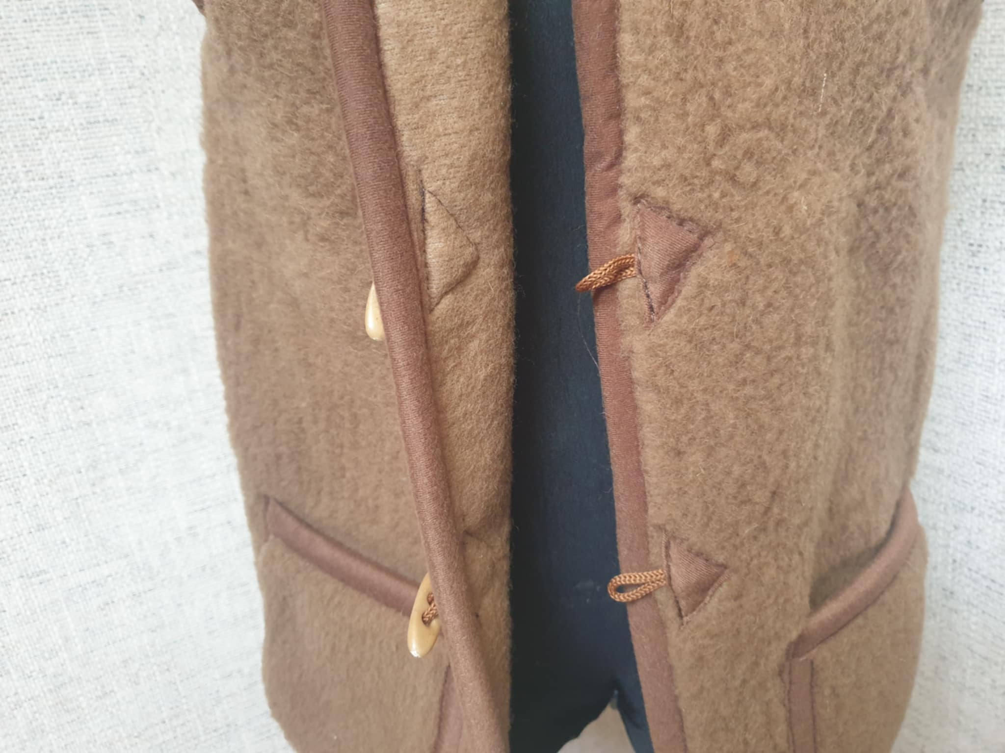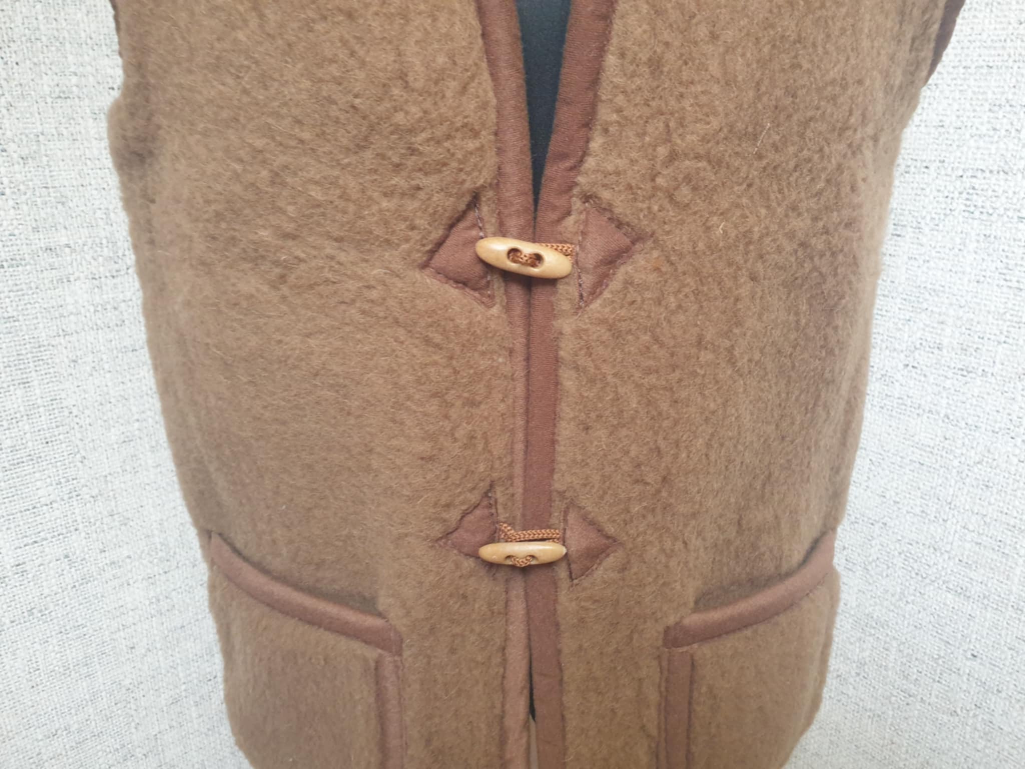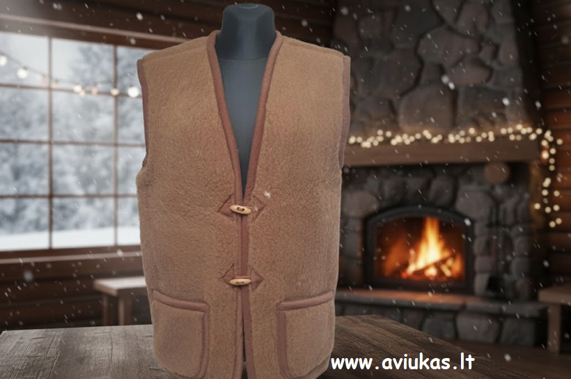 Natūralios vilnos liemenė. Tinka tiek moterims tiek vyrams. Vilna gerai išlaiko šilumą, bet leidžia kūnui kvėpuoti. Užsisega sagomis. Kišenės išorėje.